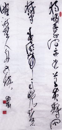 梵高,毕加索的作品之所以能成为世界名画,是因为他们的作品抛去了所有物象表面的东西,所表达的只有一颗被净化了的心灵。因而它有一种强大的震撼力,感染力和视觉冲击力。张旭、怀素的草书是一种情致的表达。娴熟的技法,随意的挥洒,足以显现出他们过人的胆量与磅礴的情怀。其书法线条的灵动像一头受过训的野马突然脱缰,驰骋纵横,肆意狂奔。可谓“目中无人”。完全是在充分理解和运用古法的基础上一种游刃有余的表现,而这种表现的背后是对艺术的大彻大悟,厚积薄发。