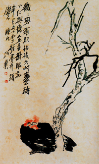 陈启业不仅精于书法,其画亦意境清远,格调不俗。他50岁开始学画,即他所谓断缘再续,他的画初师吴昌硕、白石老人,继而上追石涛、八大山人。他开始学画苦无名师指点,全靠书本及个人领悟,笔下那些朴拙的山野花木、清风鸣禽,正是画家旷达、自由心态的自然流露。