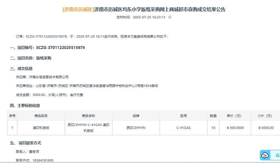 济南市历城区坞东小学版纸采购成交公告