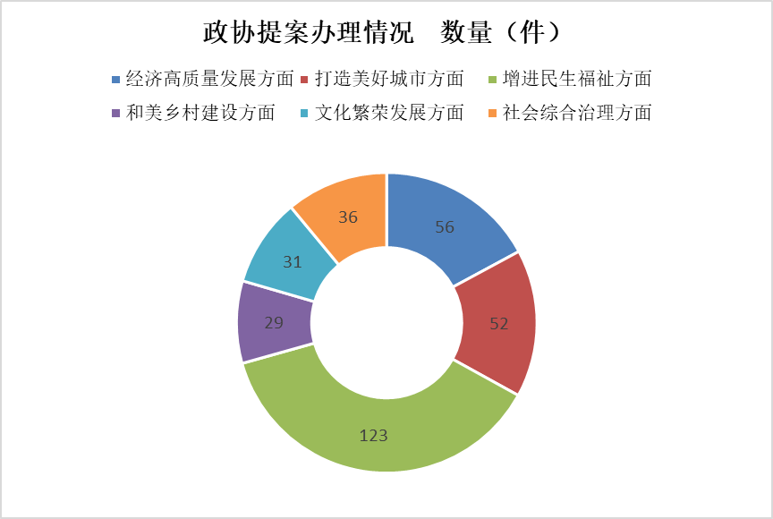 区政协十届三次会议以来,区政府负责承办的提案共计327件。其中,经济高质量发展方面56件,占17%;打造美好城市方面52件,占16%;增进民生福祉方面123件,占37%;和美乡村建设方面29件,占9%;文化繁荣发展方面31件,占10%;社会综合治理方面36件,占11%。经过区政府各承办单位的共同努力,全部提案已按规定时限办理面复完毕。