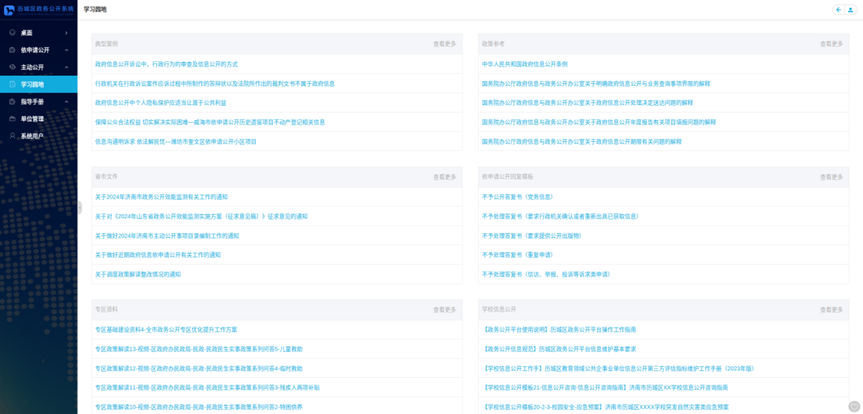 1.持续完善历城区政务公开平台。一是改造依申请公开办理模块,实现依申请公开办件“一案一档”,做到受理零遗漏、答复全及时;完善“红黄牌”督办机制,严格办理时限,避免漏件或超期答复;强化数据研判,建立数学模型,为主管部门科学决策提供数据支撑。二是完善“学习乐园”模块,在前期基础上,增设“省市文件”“依申请公开回复模板”“专区资料”等5个栏目,补充常用事项资料,便于各单位查阅参考。三是拓展主动公开模块。增设政务新媒体管理栏目,提供数据统计和无感转发功能,提升全区政务新媒体运维能力;增设网站巡查问题整改栏目,将网站检查结果直接推送至相关单位,优化传统反馈流程,节约沟通成本,提高全区主动公开水平。