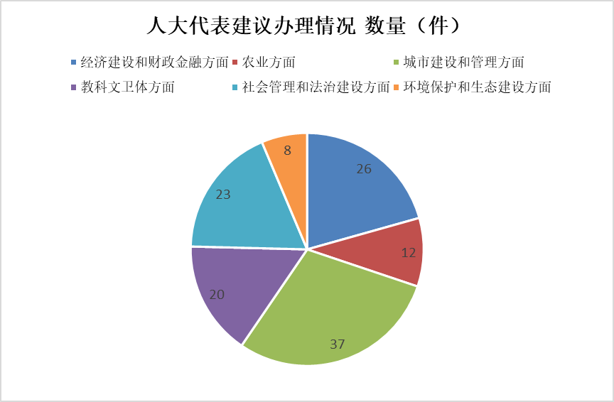 区十九届人大三次会议以来,区政府负责承办的建议共126件。其中,经济建设和财政金融方面26件,占21%;农业方面12件,占10%;城市建设和管理方面37件,占29%;教科文卫体方面20件,占16%;社会管理和法治建设方面23件,占18%;环境保护和生态建设方面8件,占6%。经过区政府各承办单位共同努力,代表建议已按程序办理完毕并答复代表。