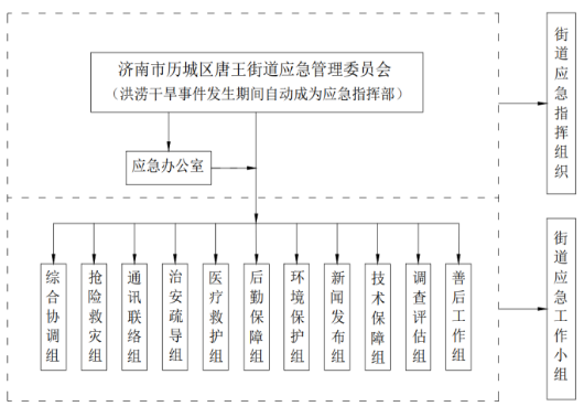 济南市历城区唐王街道防汛抗旱应急救援组织体系,与济南市历城区唐王街道突发事件总体预案应急组织体系一致,由应急指挥组织、应急工作小组及成员单位组成。