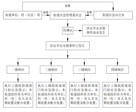 (1)负责本街道的应急救援队伍建设工作; (2)负责本街道的应急保障系统建设工作; (3)定期组织应急预案的修编工作; (4)负责应急预案的贯彻落实情况,定期或不定期对本街道应急队伍建设、应急保障系统、应急预案演练等情况进行检查; (4)落实国家相关的应急管理政策,执行和落实上级下达的应急任务。 | (1)水旱灾害事件发生后,对属于上级政府或部门负责处理的,在上级政府或部门组织的应急组织到达事件现场前,本街道在应急能力范围内先期处置,在上级政府或部门组织的应急组织到达事件现场后,本街道应急组织的指令配合处置。 (2)水旱灾害事件发生后,对属于本街道负责处理的,本街道在应急总指挥的统一领导下,组织、指挥、协调各应急工作小组进行应急处置。 |