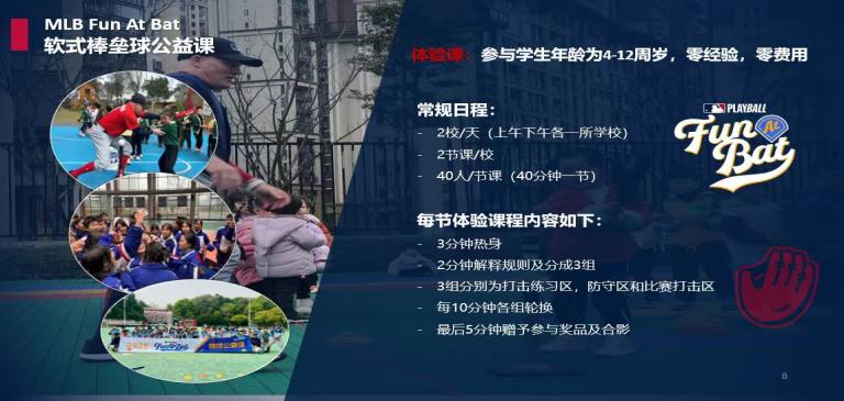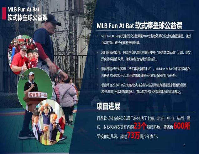 •MLB Fun At Bat软式棒垒球公益课是MLB专业教练精心设计的启蒙课程,通过互动游戏让孩子们体验棒球乐趣。 •项目响应教育部、国家体育总局和共青团中央“阳 光体育运动”计划,落实深化体教融合政策,推动棒球在各级校园普及。