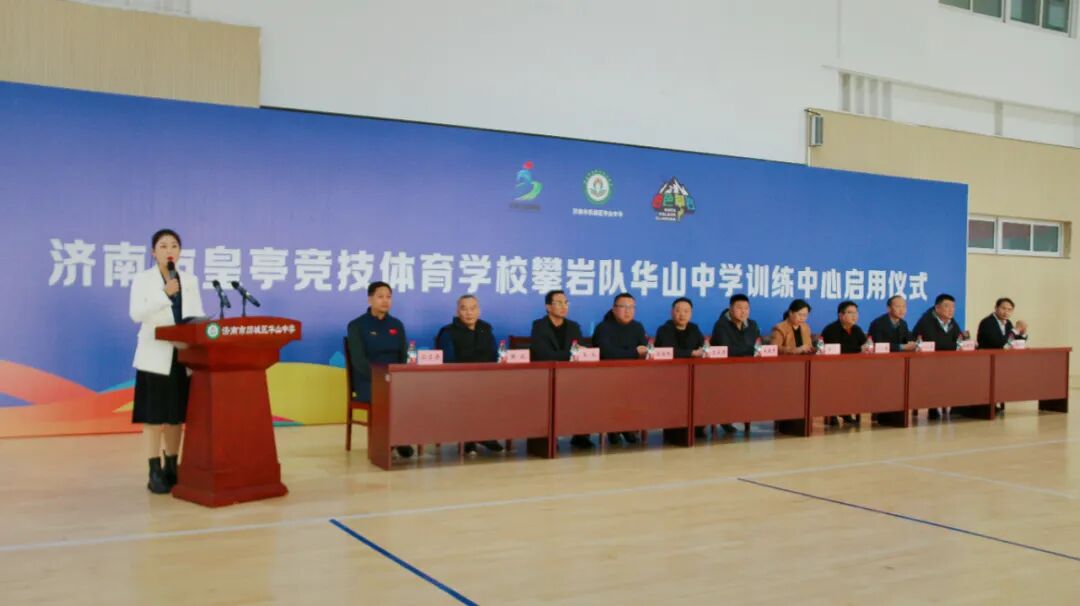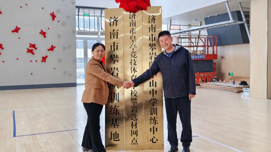 济南市体育局副局长王建军、历城区副区长侯莉共同为“济南市皇亭竞技体育学校攀岩队华山中学训练中心”揭牌。